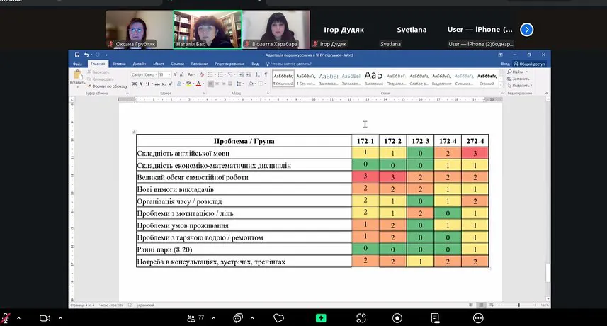 Подальше спілкування відбувалося в академічних групах, де батьки зустрілися з кураторами — доц. Наталією Андріївною Бак, проф. Наталією Степанівною Островською, доц. Наталією Ярославівною Сокровольською та доц. Оксаною Михайлівною Грубляк. Під час зустрічей було обговорено результати навчання студентів, їхні успіхи та досягнення, а також окреслено шляхи подальшої співпраці між кафедрою, студентами та батьками.